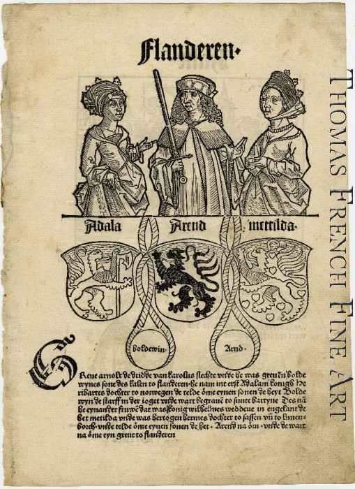 Title: Recto: has heading "Flanderen," with woodcut illustration of Adala, Arend, and Mettilda and their arms. Verso: has heading "Halle," with woodcut illustrations of a man with a sword standing outside a castle, a bishop, and a shield.