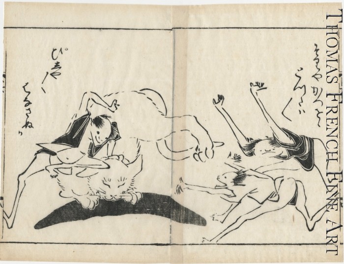Double folio from the illustrated book "Toba-ya Ogi-no-Mato (The Target of the Fan)," Depicting Three Men and a Giant Cat"