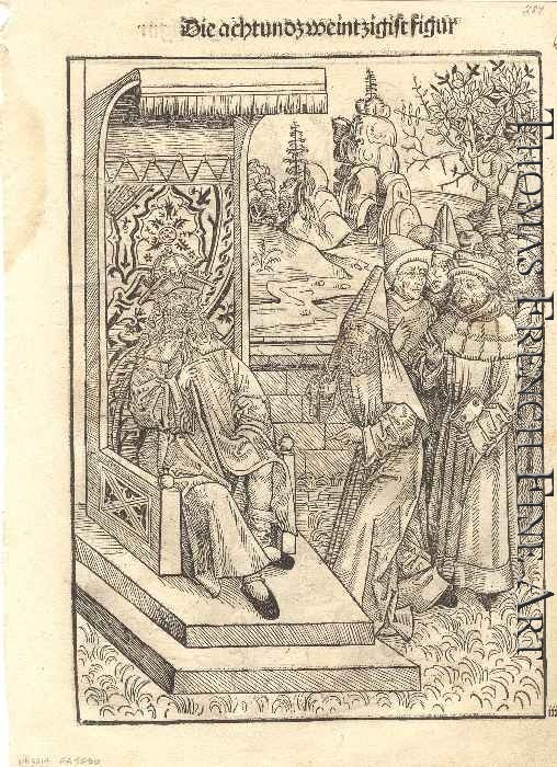 Title: Father Stefan Fridolin, "Schatzbehalter" (Treasury of the True Riches of Salvation): Recto: The 28th Figure - Wise Men of the East Make Inquiry of Herod (Matthew 2:1-6); Verso: The 29th Figure - Martyrdom of Sts. James the Great and the Less (Acts 12:2)