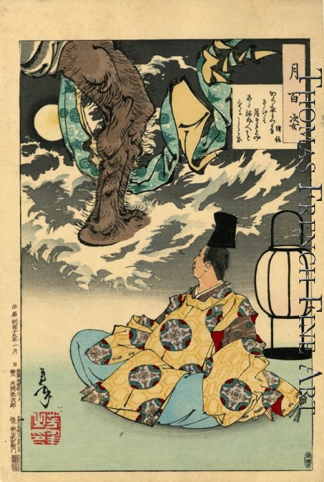 One autumn night, as the courtier Tsunenobu (1016-1097 AD) watches the moon rise, he hears the sound of someone pounding cloth in the distance. Reminded of a famous Tang Chinese poem, he recites the following verse: "I listen to the sound of cloth being pounded as the moon shines serenely, and believe that there is someone else who has not yet gone to sleep." As Tsunenobu finishes a gigantic demon appears in the sky and recites a couplet by the Tang poet Li Bo (701-762 AD):"In the northern sky geese fly across Big Dipper - to the south cold robes are pounded under the moonlight."