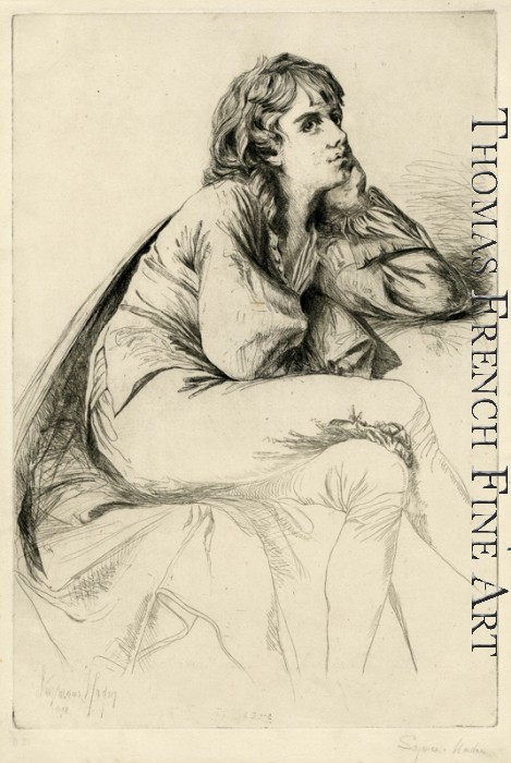 After a painting by Joseph Wright of Derby, entitled "Edwin the Minstrel." The sitter was the artist's grandfather, Thomas Haden of Derby, also a surgeon. The etching may have been based on the mezzotint reproduction of the painting. This is one of Haden's few portrait etchings, and was included in Haden's Etudes a l'eau-forte (1866).